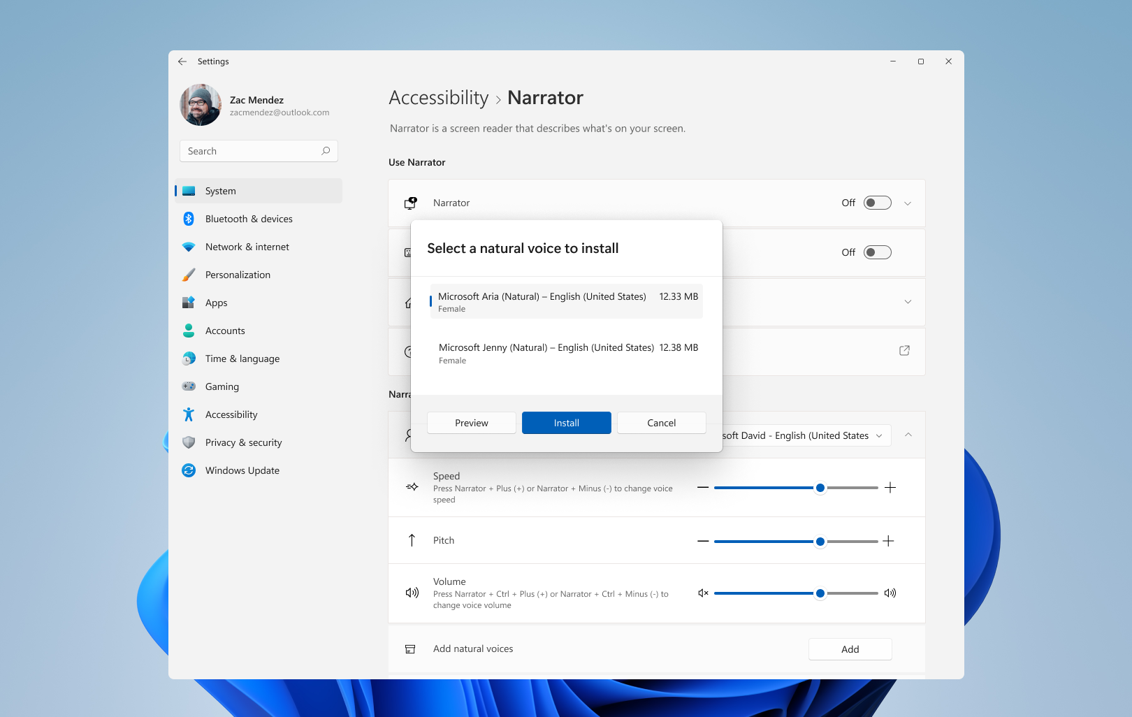 Narrator will let you know new natural voices are available to install when launched.[/caption] Select “Install now” on the announcement window to go to Narrator Settings to add the new voices. From there you can select “Add” button under the “Add natural voices” section. The dialog allows you to select either the “Jenny” or “Aria” voice. Both voices can be installed but must be installed separately. You can click “Preview” to hear a preview of the voice and you can select “Install” to start the download of the selected voice. [caption id="attachment_175473" align="alignnone" width="794"]